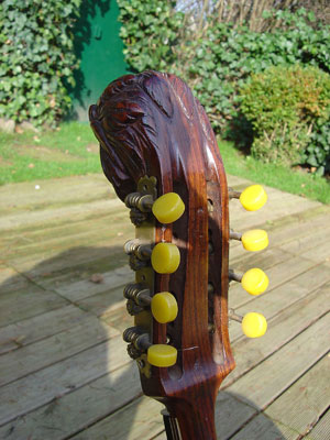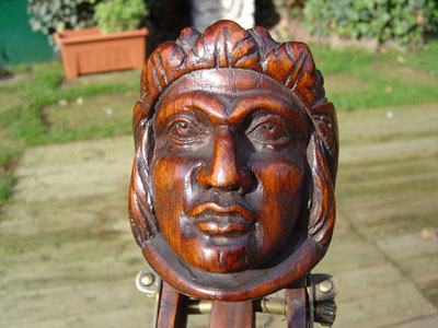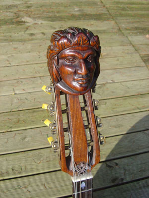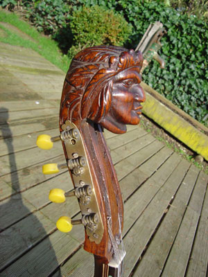 Big Chief carving on peg head of a Ludwig mandolin banjo